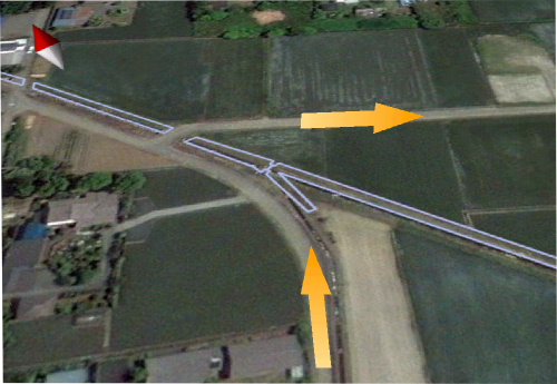 ②北方面(堤防方面)へ直進。道路が左カーブしてきたら、ガードレールの切れ目を右折